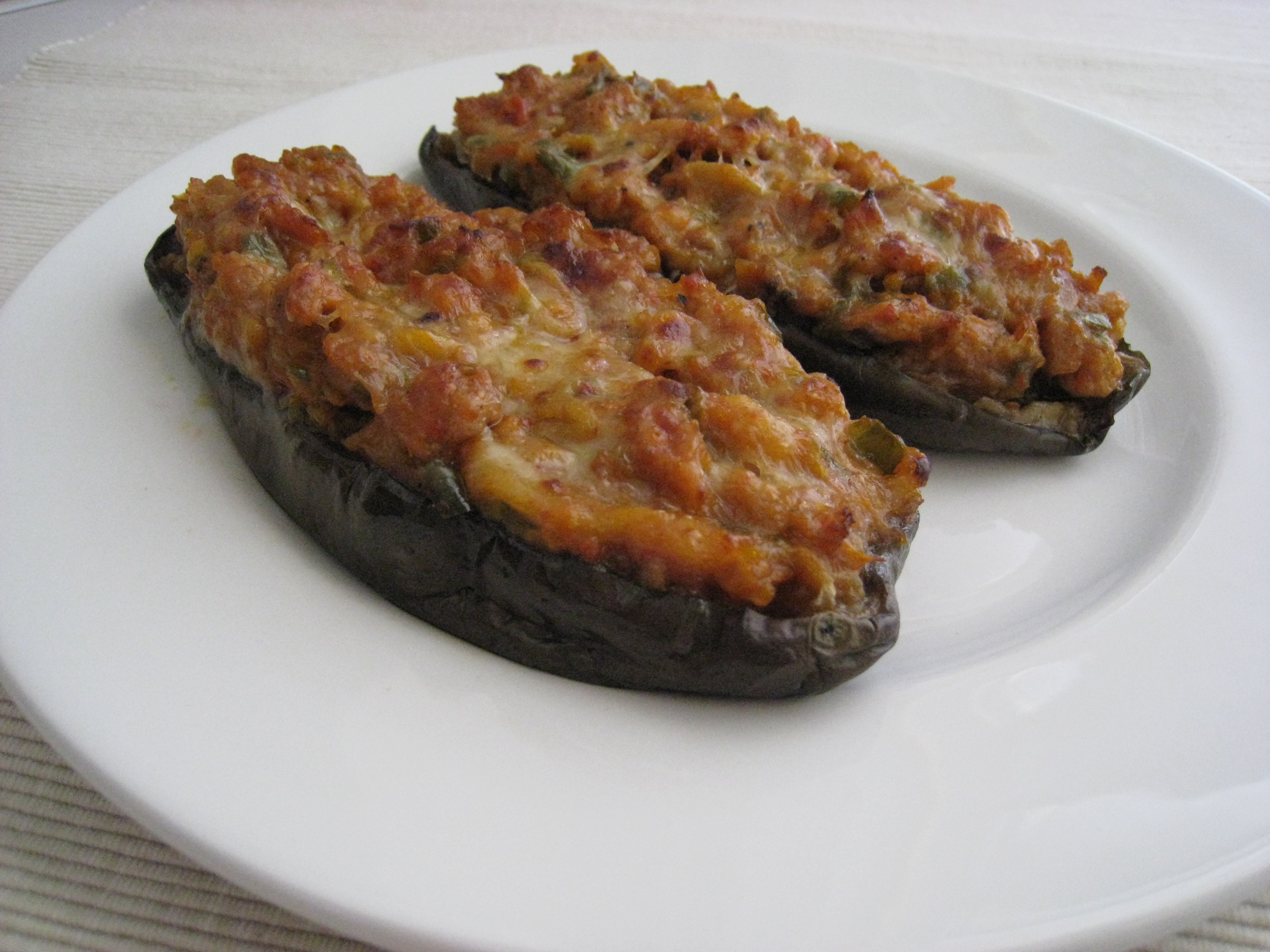 - Rellenar las berenjenas, cubrirlas de queso y gratinar 2-3 minutos a 250º (colocar en la parte alta del horno).