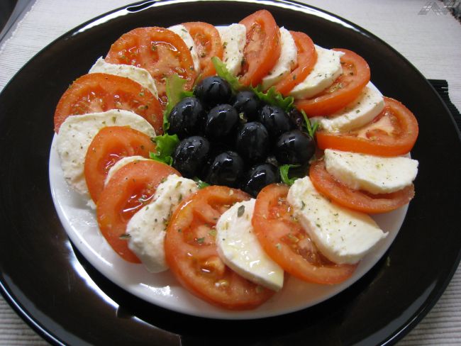 - En un plato plano, alternar rodajas de tomate y de mozzarela.