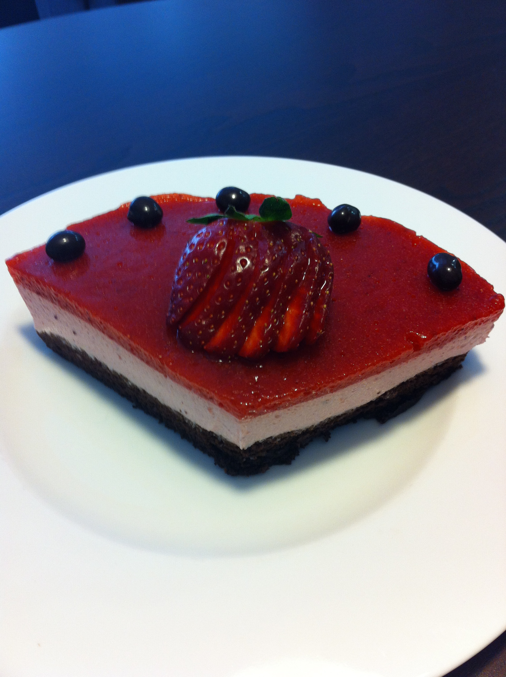 Consejo: Dejar enfriar la tarta, 15 minutos, en la nevera antes de verter la cobertura de fresa.